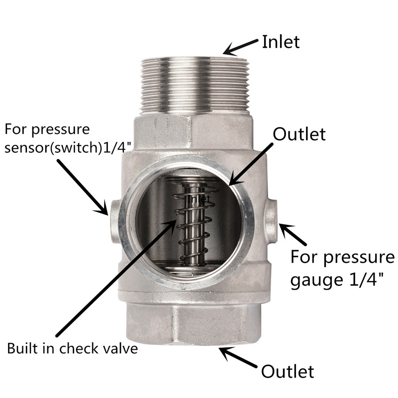 Các giao diện: cổng cái 1 inch (đầu vào nước), cổng đực 1 inch (đầu ra nước), cổng cái 1 inch khác (để kết nối van một chiều), cổng cái 1/4 inch (để kết nối công tắc áp suất), cổng đực 1/4 inch (để kết nối đồng hồ đo áp suất).