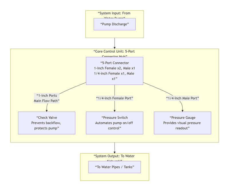 Đặc điểm cốt lõi của Đầu nối năm chiều bằng thép không gỉ không có van kiểm tra do Nhà máy Joepai sản xuất là thân van có năm cổng: 1" nữ x 1" nữ x 1" nam x 1/4" nữ x 1/4" nam. Đây là bộ phận kết nối thuần túy với kênh rỗng bên trong và không có bộ phận chuyển động, đồng thời không có bất kỳ chức năng điều khiển nào như van một chiều hoặc bộ điều chỉnh. Mục đích duy nhất của nó là thu thập hoặc phân phối chất lỏng. Đối với bộ điều khiển hệ thống máy bơm nhỏ, đầu nối năm chiều hoạt động như một giá đỡ tích hợp nhỏ gọn nền tảng, tập hợp tất cả các thành phần giám sát và bảo vệ quan trọng.